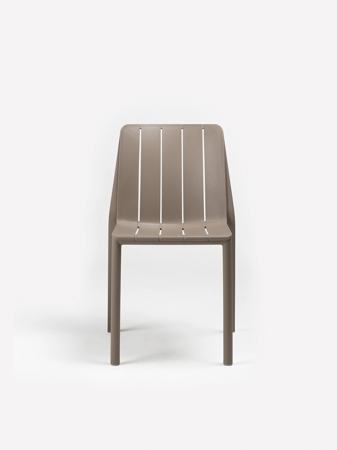 Den miljövänliga lamellstolen Tiberina Bistrot, utan armstöd, har rundade linjer och rundade ben.