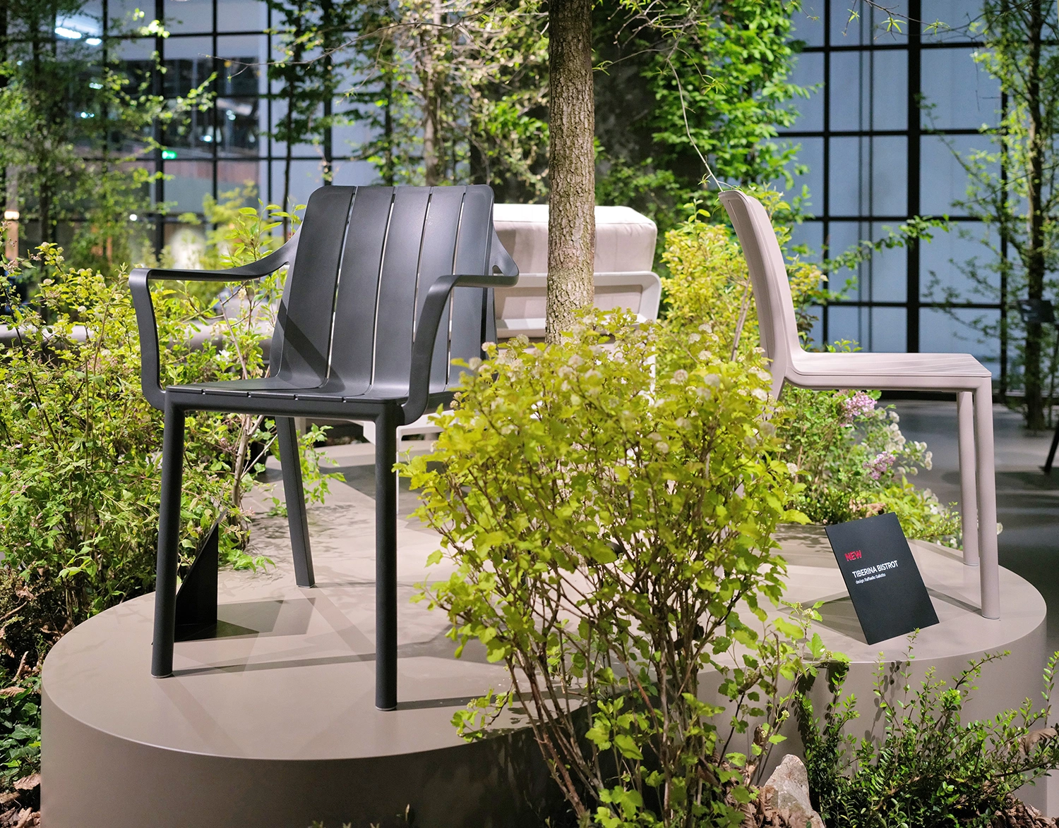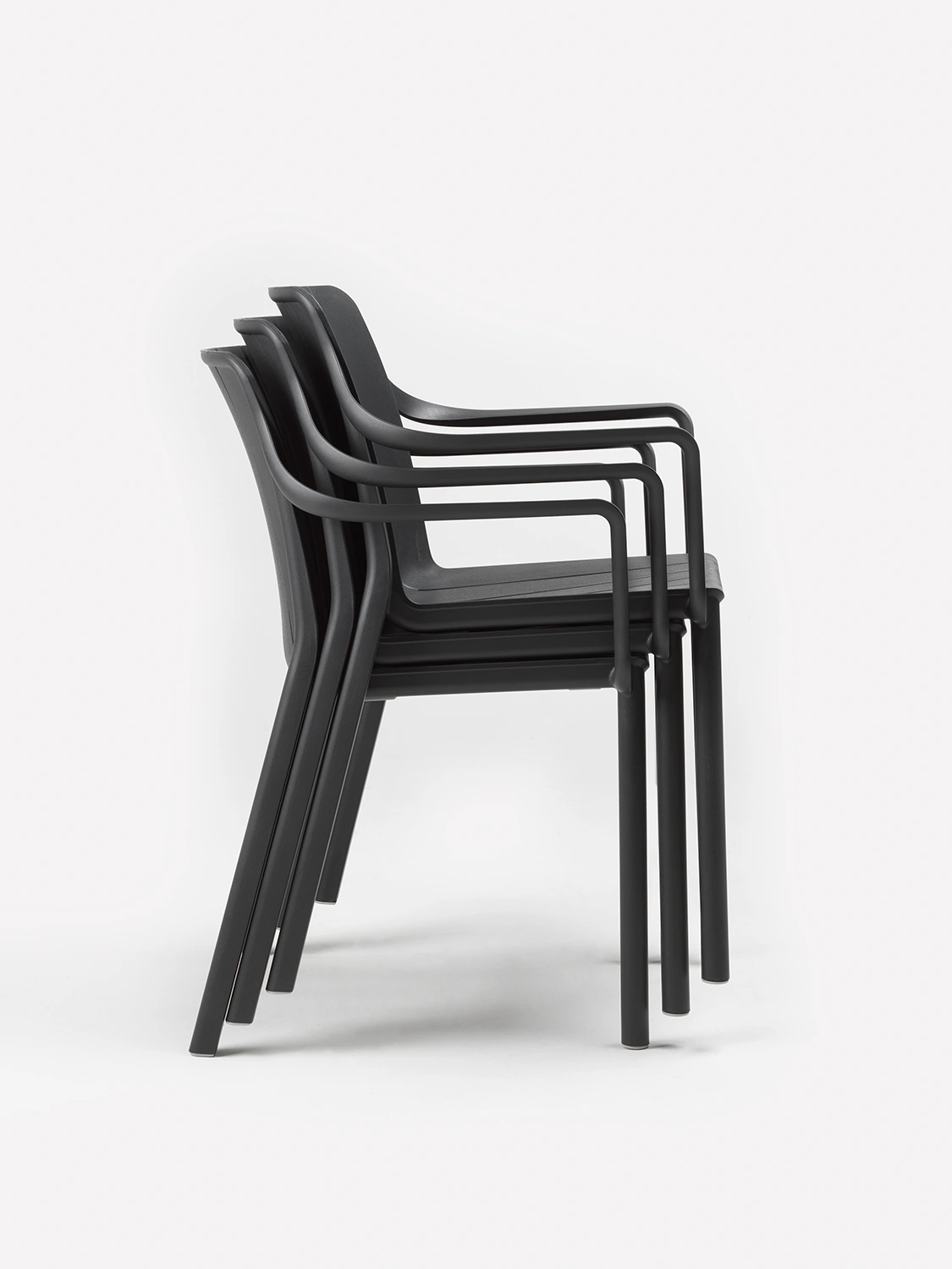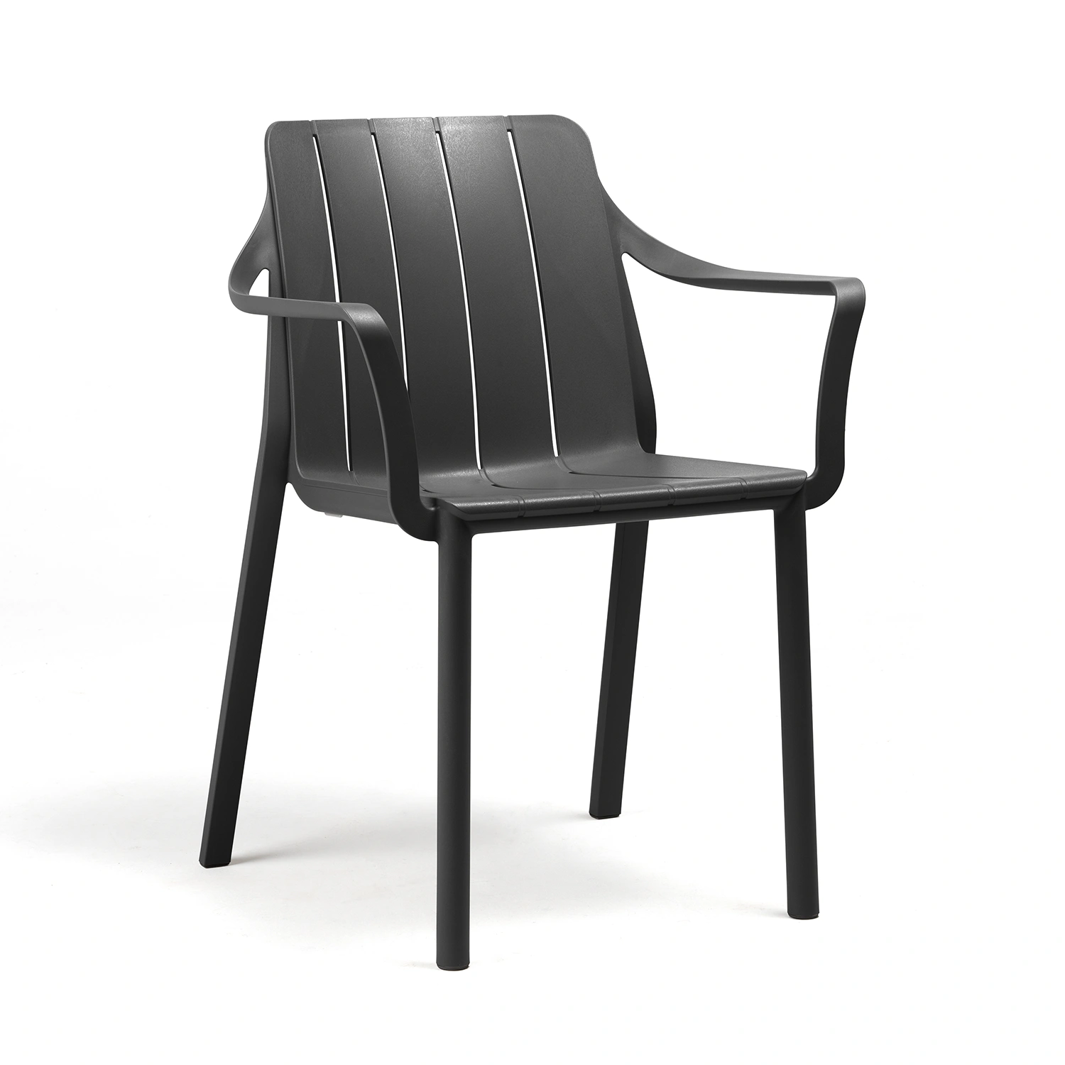 Den miljövänliga lamellstolen Tiberina, med armstöd, har rundade linjer och rundade ben.