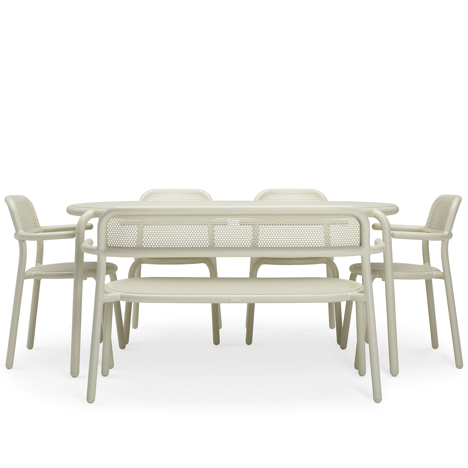 Toni Tavolo matgrupp i aluminium med Bankski bänk från Fatboy. Matgruppens stolar, bänk och bord finns i flera olika färger.