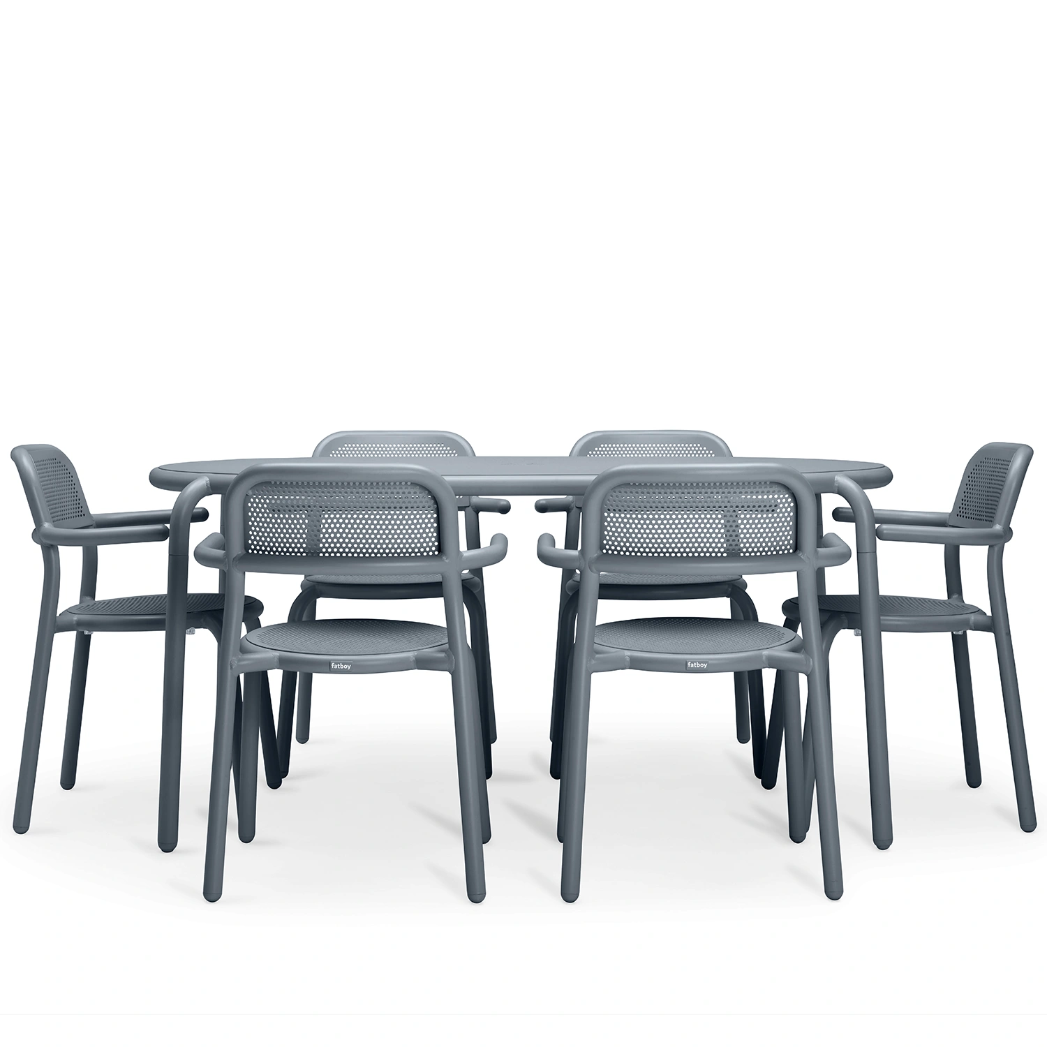 Toni Tavolo matgrupp i aluminium från Fatboy. Matgruppens stolar och bord finns i flera olika färger.