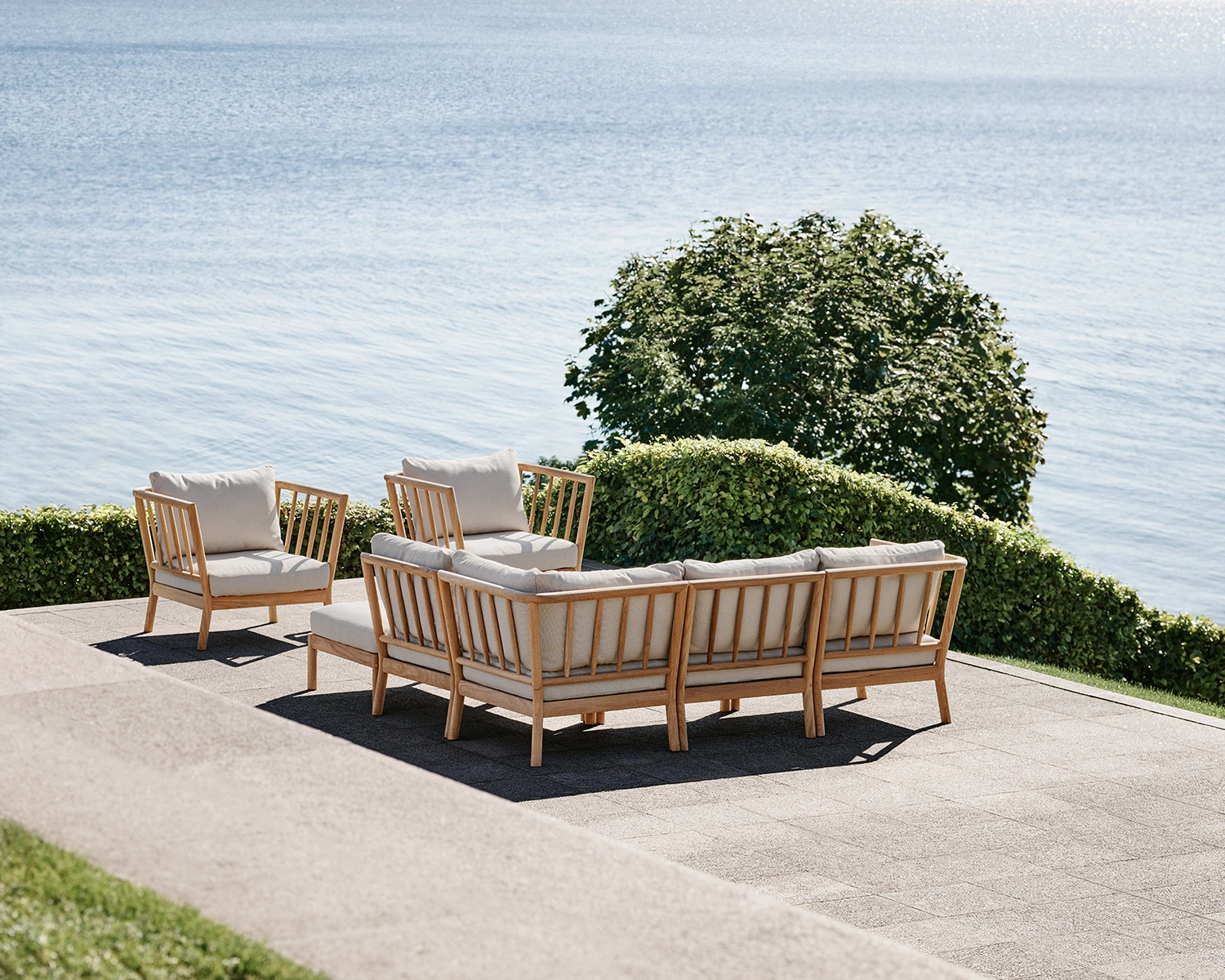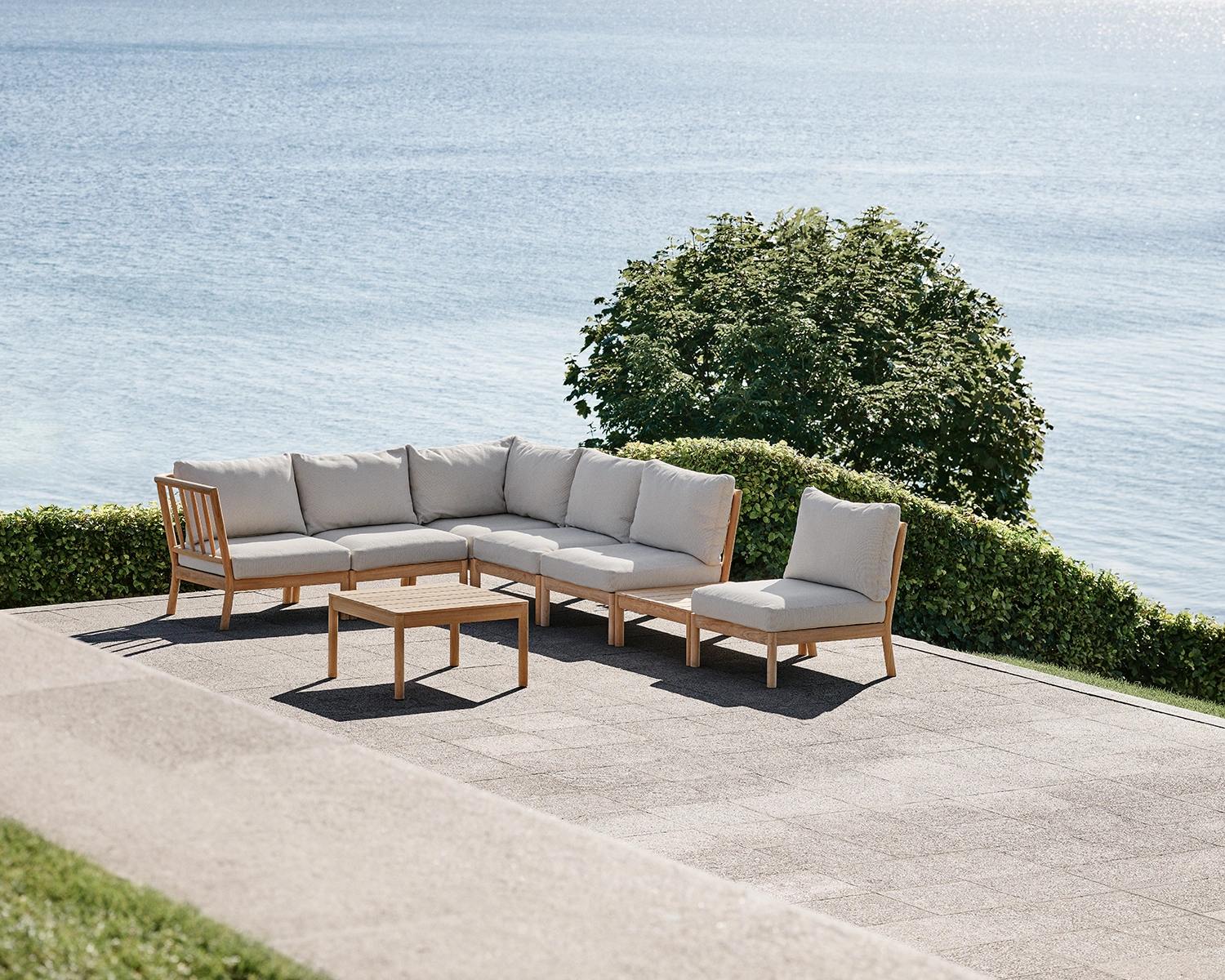Tradition hörnmodul tillverkad i teak med dynor i färgen light sand. Tradition hörnmodul utökar loungegruppen för utomhusbruk med en generös och bekväm vadderad hörnsits. Tillverkad i samma högkvalitativa material och med fokus på detaljer, lindas ryggstödet runt på två sidor och kan fästas säkert för att skapa en sömlös och stabil loungeupplevelse.