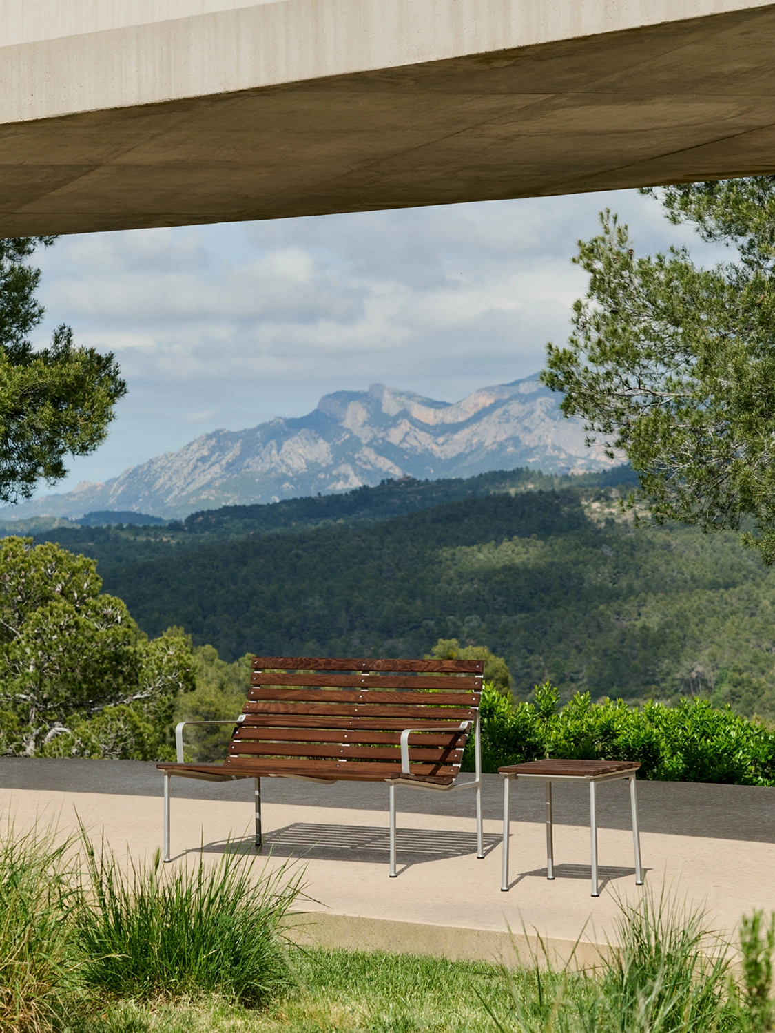 Traverse loungesoffa med stomme i gjuten aluminium och ribbor i värmebehandlad ask.
