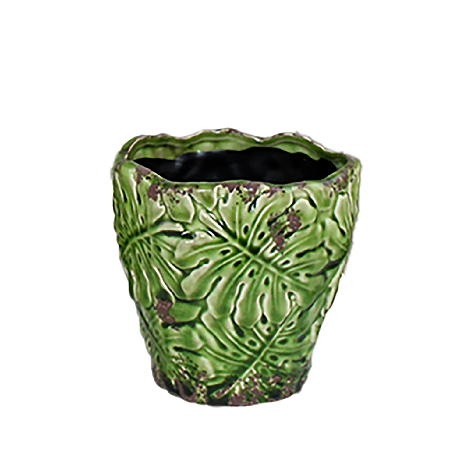 Tyra är en kruka med karaktär – glaserad i grönt och prydd med ett livfullt bladmönster som för tankarna till frodiga trädgårdar och patinerade loppisfynd. Den är handgjord i stengods och bär på små skiftningar i form och glasyr, som gör varje exemplar unikt. En liten kruka med stor personlighet.
