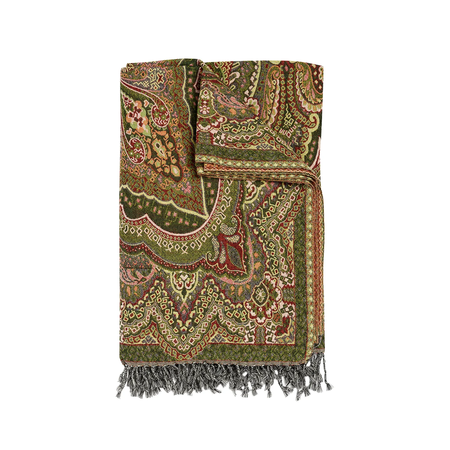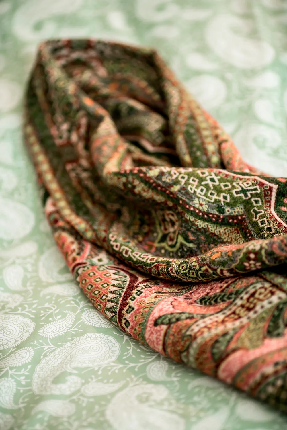 Ullpläd Paisley grön/persika 145×200 cm