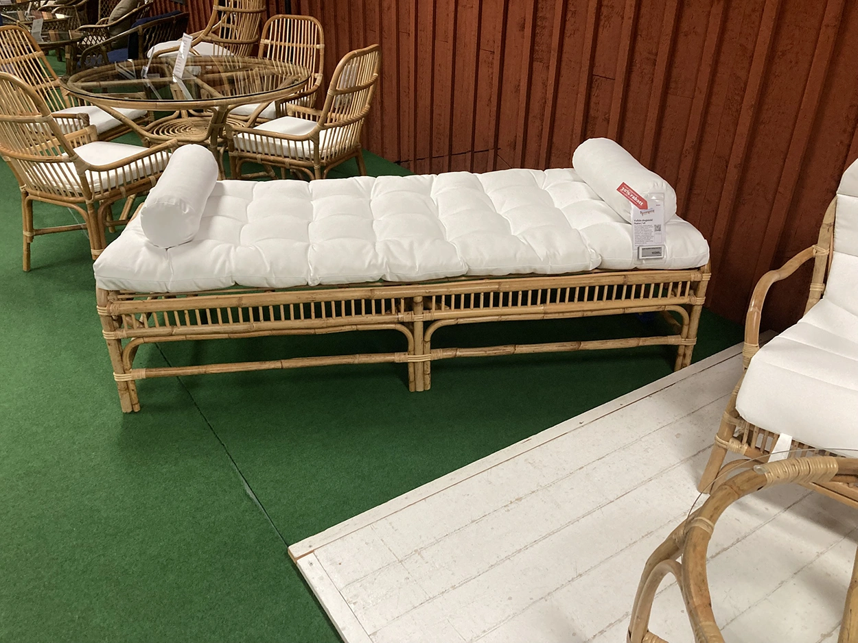 Sommaren är dagbäddens tid, denna mångsidiga möbel passar lika bra för en tupplur som för samtal med vänner eller som en extra sittplats i loungehörnan. Vallda dagbädd är generös i storleken och bjuder med sin tjocka, bekväma madrass och matchande kuddar in till avkoppling under hela sommardagen. Klassisk design i naturlig rotting gör denna till en hållbar favorit, som utan problem sprider lugn även i vardagsrum eller glasveranda när graderna går ner.