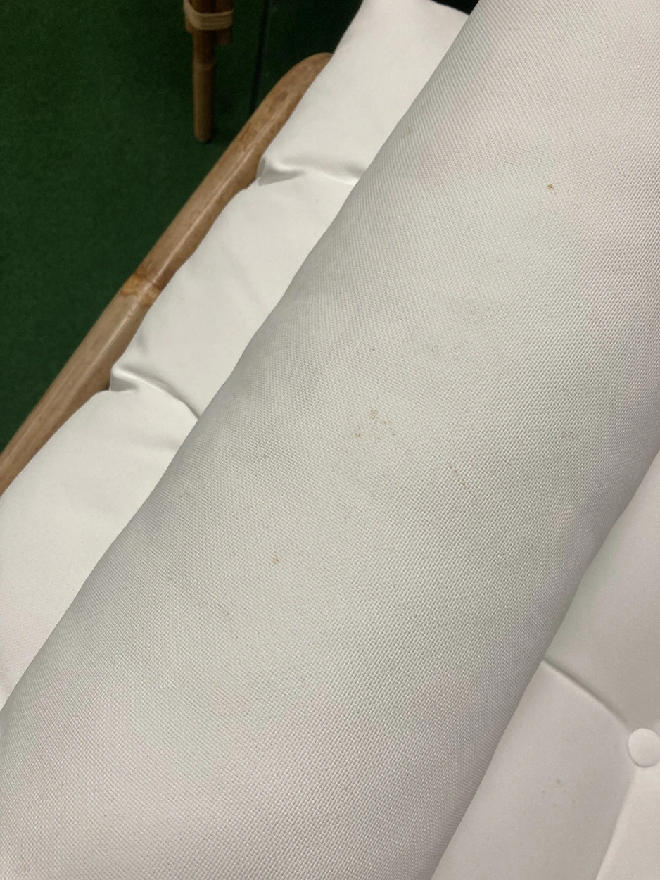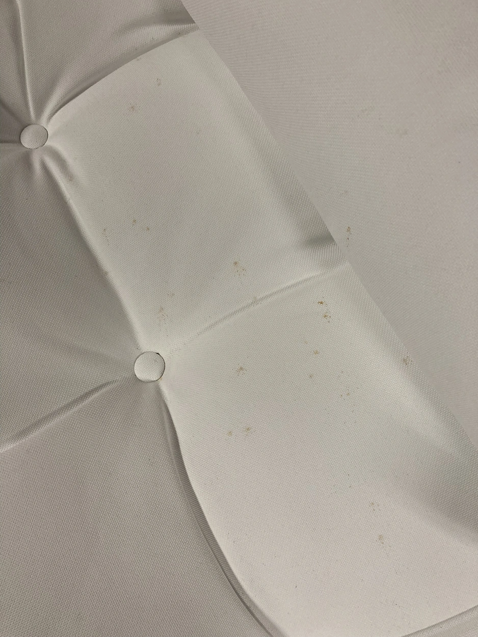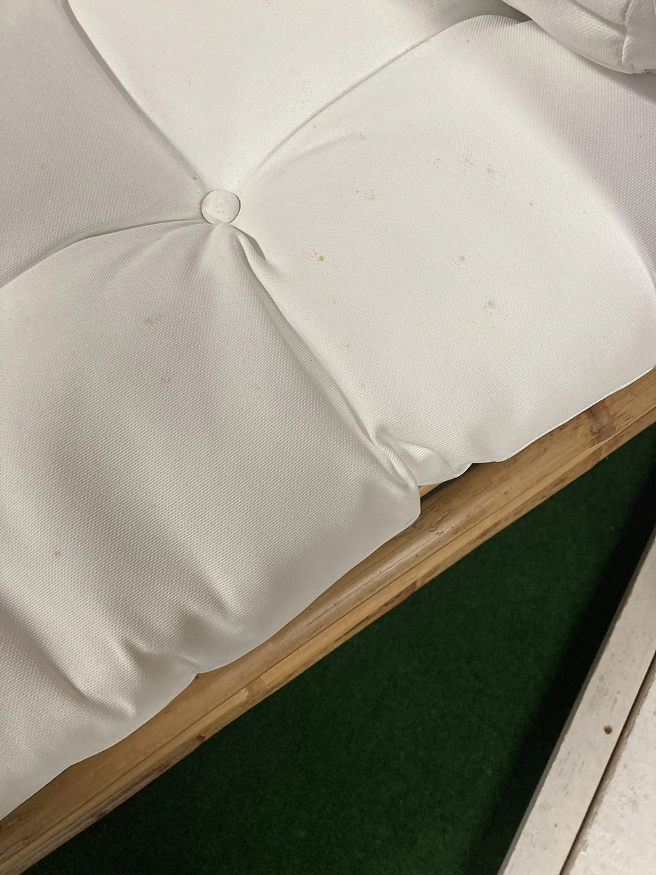 Vallda dagbädd utställningsexempler. Dagbädden är i gott skick, men dynorna har missfägningar/prickar över stora delar av tyget. Se bilder.