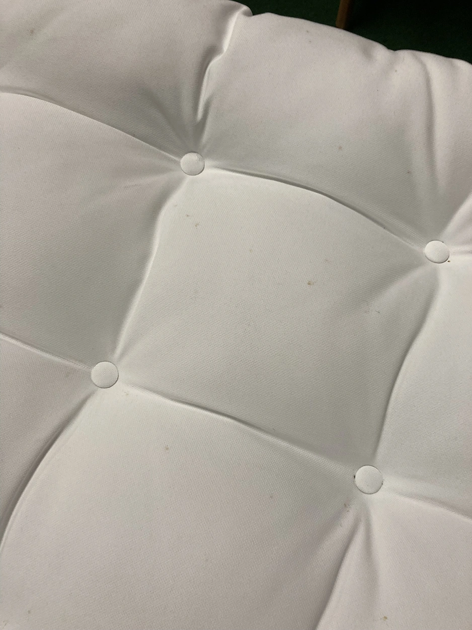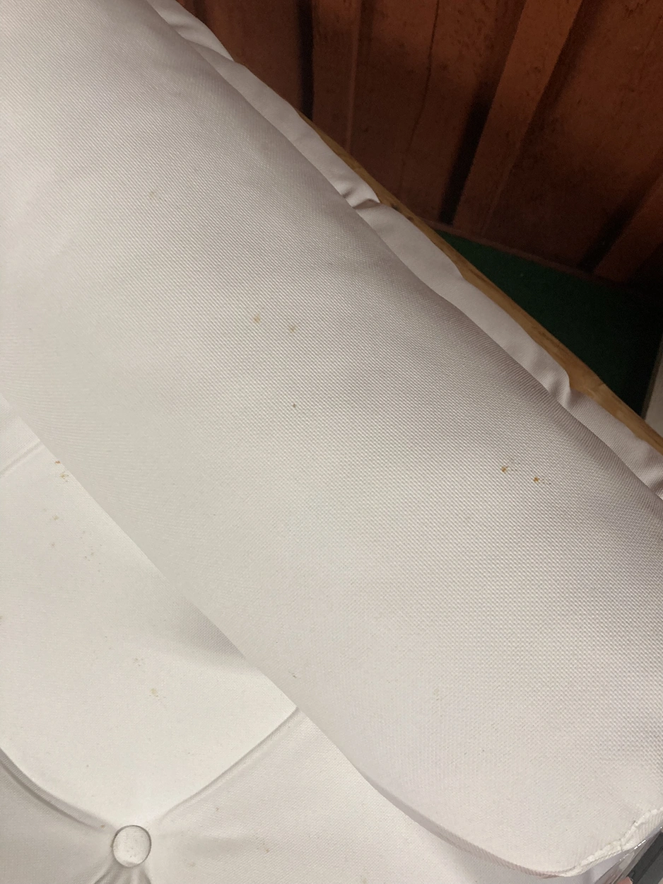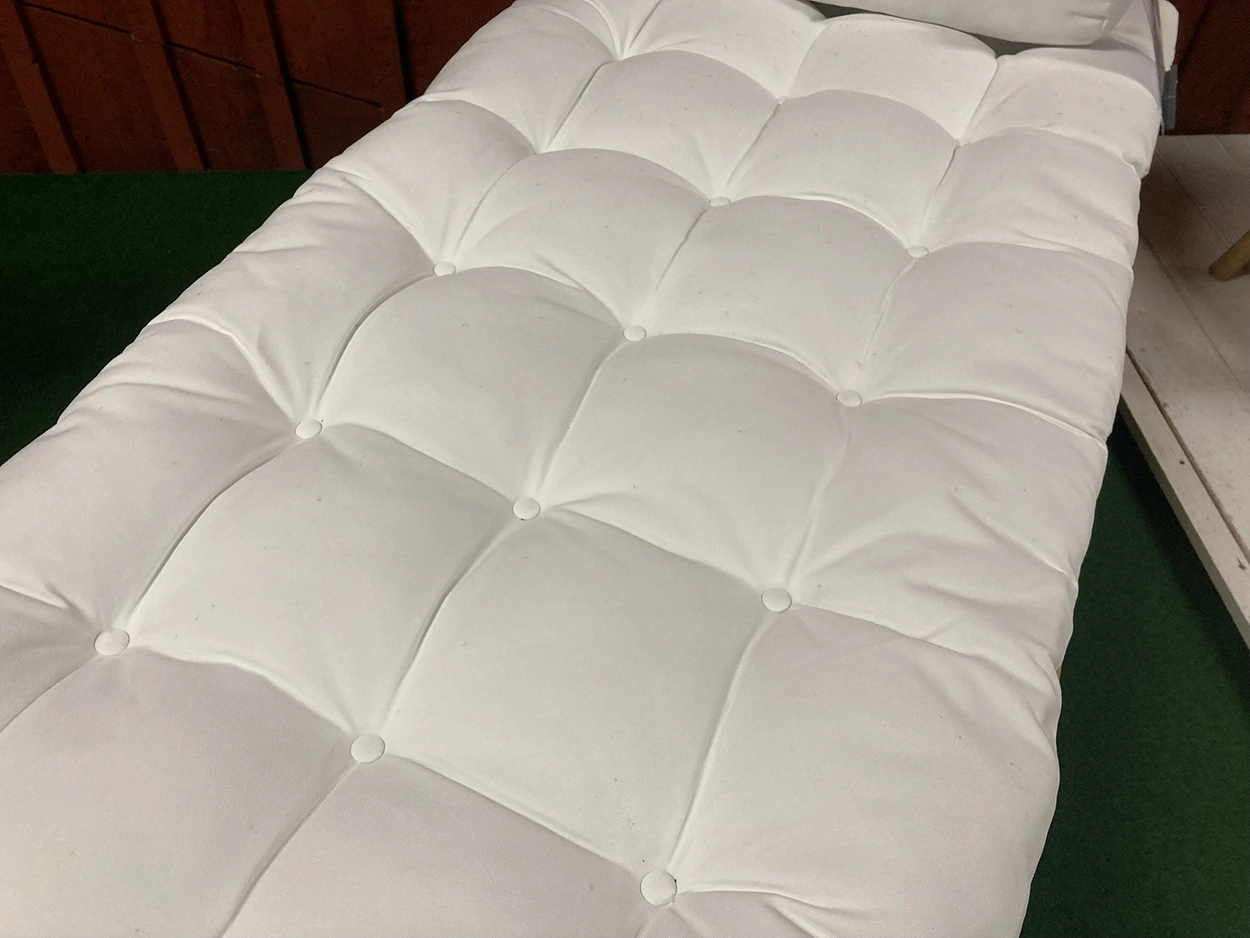 Vallda dagbädd utställningsexempler. Dagbädden är i gott skick, men dynorna har missfägningar/prickar över stora delar av tyget. Se bilder.