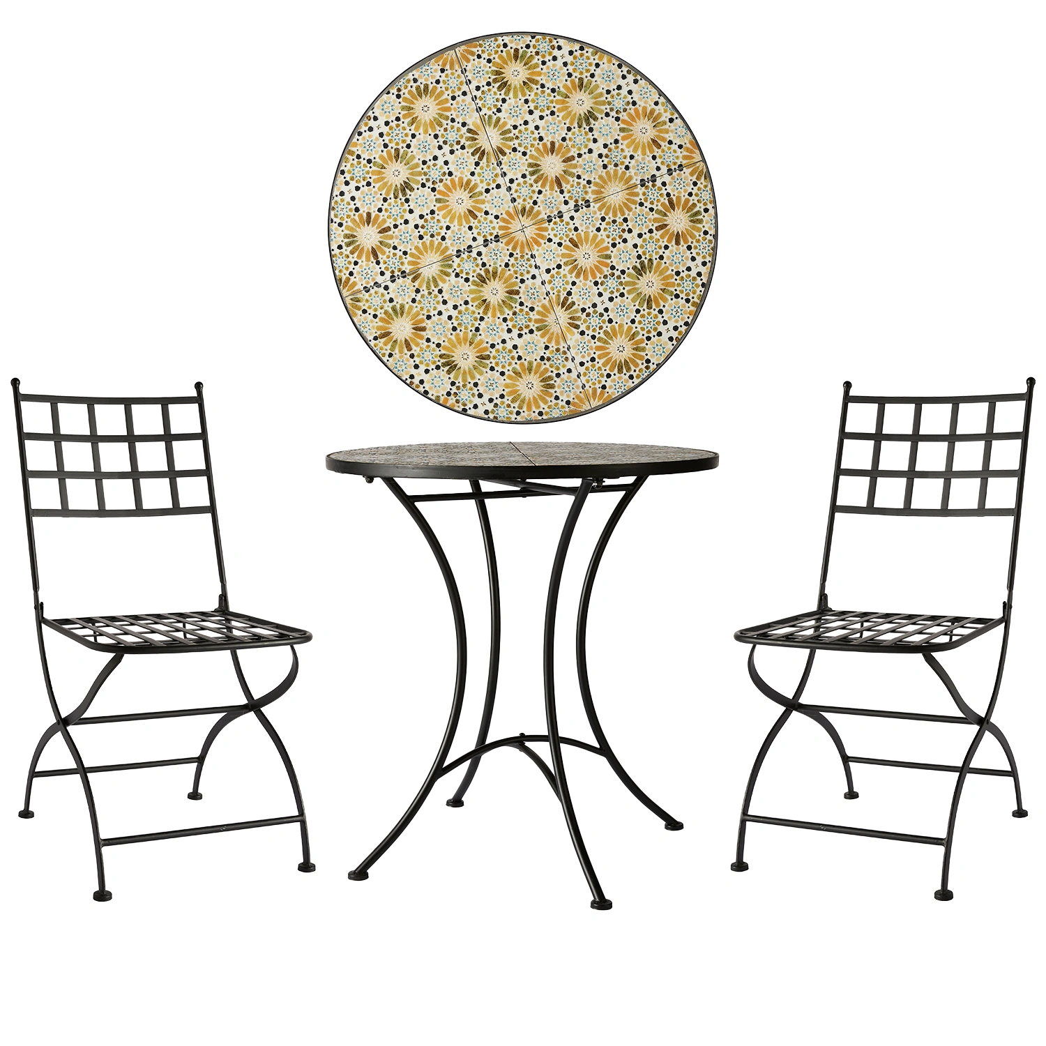Venice caféset från Wikholm form med klappstol i järn och ett vackert mosaikbord. Venice stol kommer i två modeller, antingen med rutor eller lodräta stänger i ryggen som bildar ett randigt mönster. Sitsen är rutmönstrad.