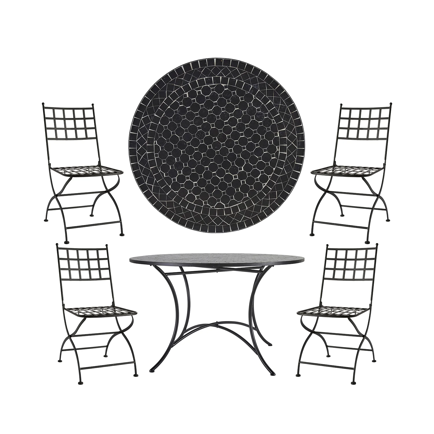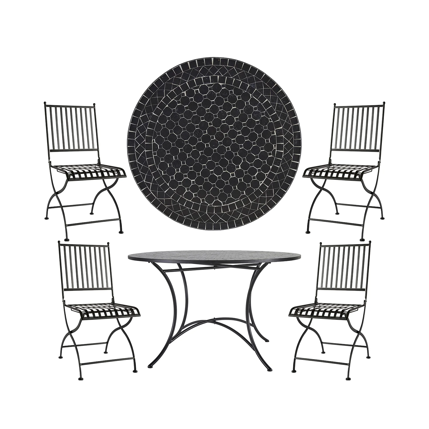 Venice matgrupp från Wikholm form med klappstol i järn och ett vackert mosaikbord. Venice stol kommer i två modeller, antingen med rutor eller lodräta stänger i ryggen som bildar ett randigt mönster. Sitsen är rutmönstrad.