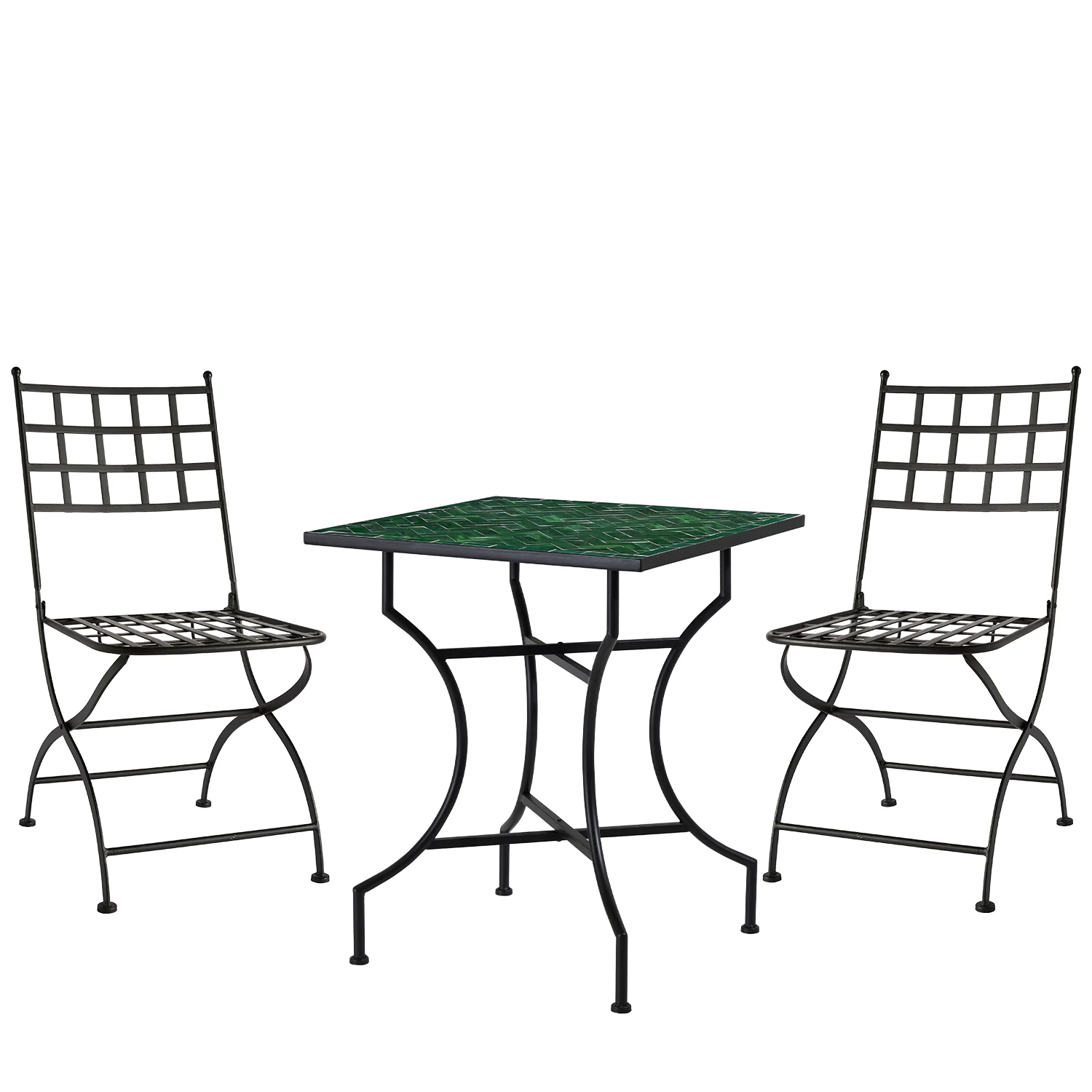 Venice/Trieste caféset från Wikholm form med klappstol i järn och ett vackert mosaikbord. Venice stol kommer i två modeller, antingen med rutor eller lodräta stänger i ryggen som bildar ett randigt mönster. Sitsen är rutmönstrad.