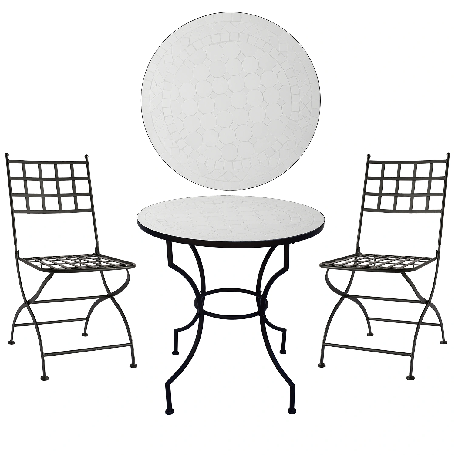 Venice/Trieste caféset från Wikholm form med klappstol i järn och ett vackert mosaikbord. Venice stol kommer i två modeller, antingen med rutor eller lodräta stänger i ryggen som bildar ett randigt mönster. Sitsen är rutmönstrad.
