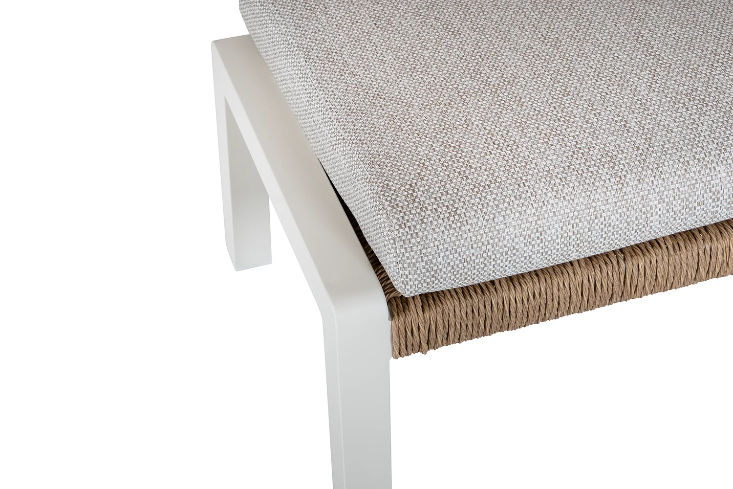 Verona är en serie utemöbler från Atleve i aluminium med detaljer i tvistad konstrotting och teak. Möblerna har stomme i ljusbeige aluminium, med twistad konstrotting i naturfärg i rygg och sits samt beiga allvädersdynor.