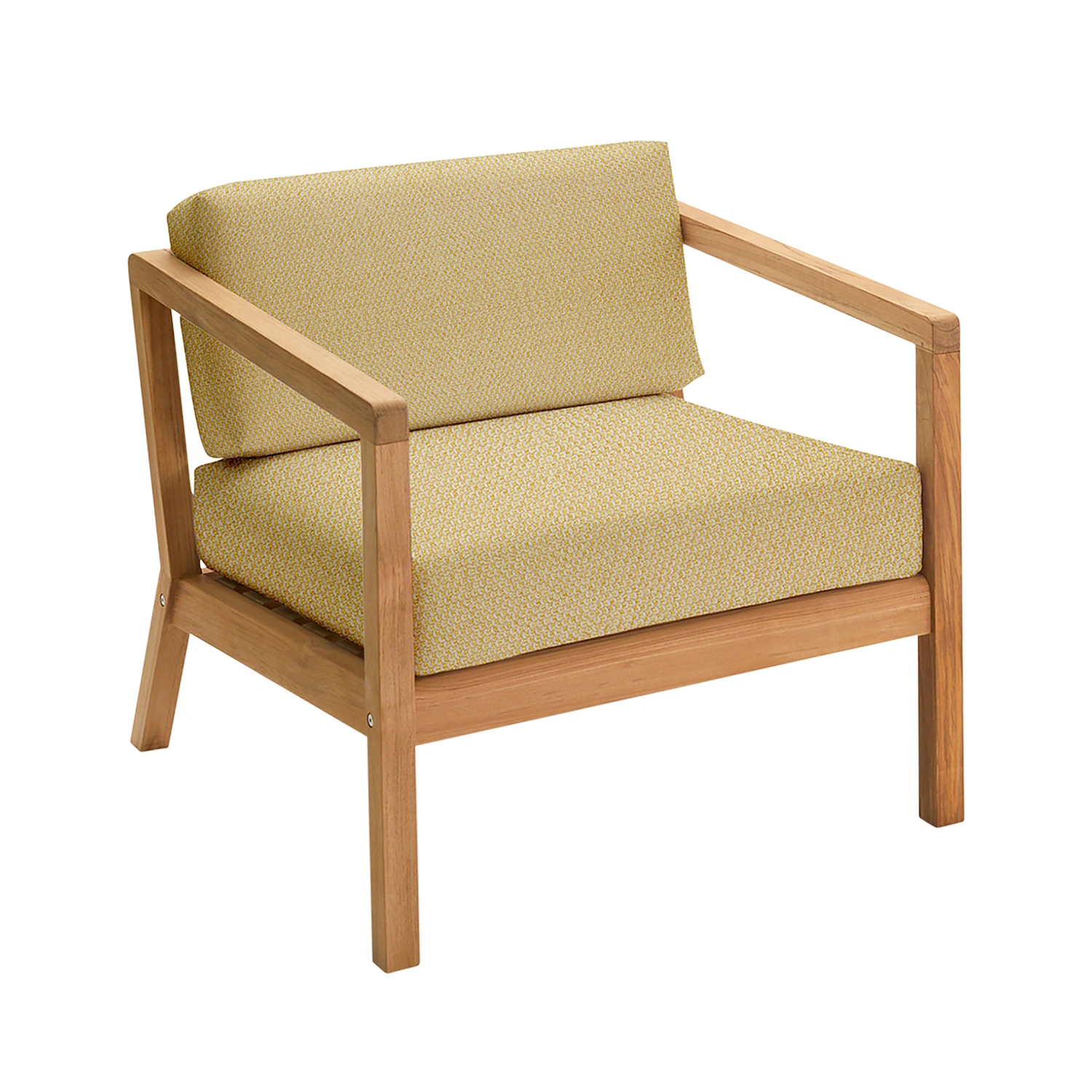 Virkelyst fåtölj med dynor i Sunbrellatyget Honey Yellow. Honey Yellow är ett lyxigt tyg med grov struktur. Virkelyst är väldigt enkel och elegant fåtölj som är både en förlängning och förnyelse av Skageraks designtradition som fokuserar på tidlös design och hög kvalitet. Kombinera med andra delar i serien, så som soffbord och soffor.