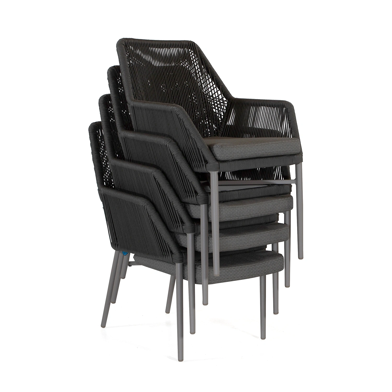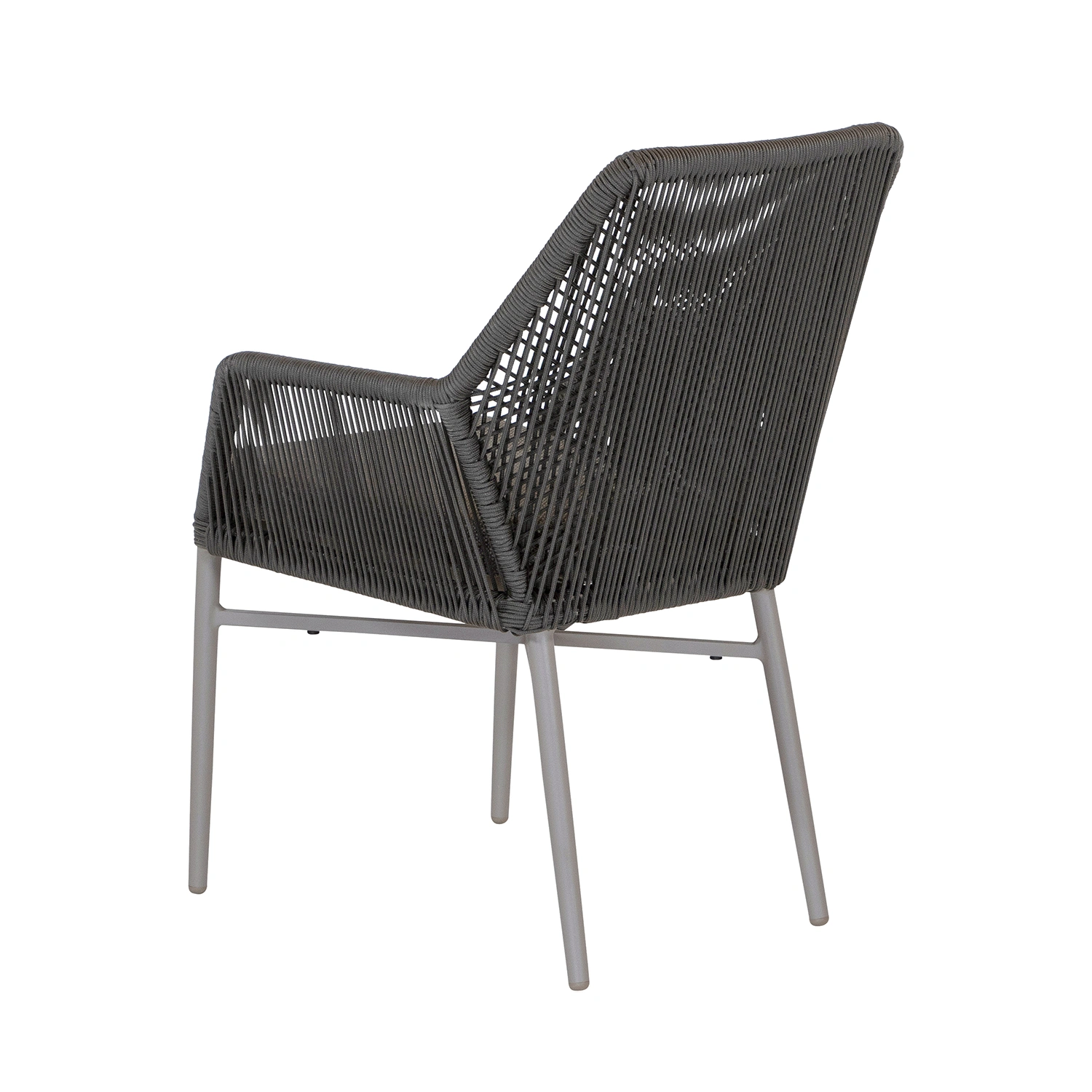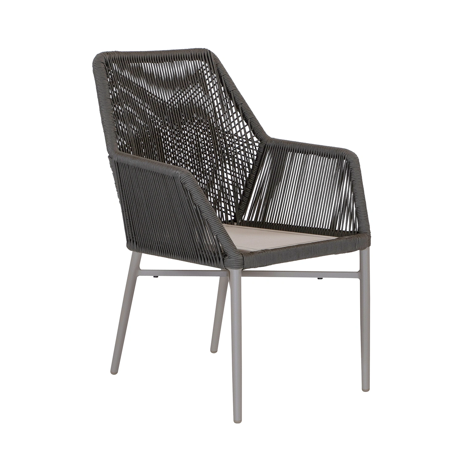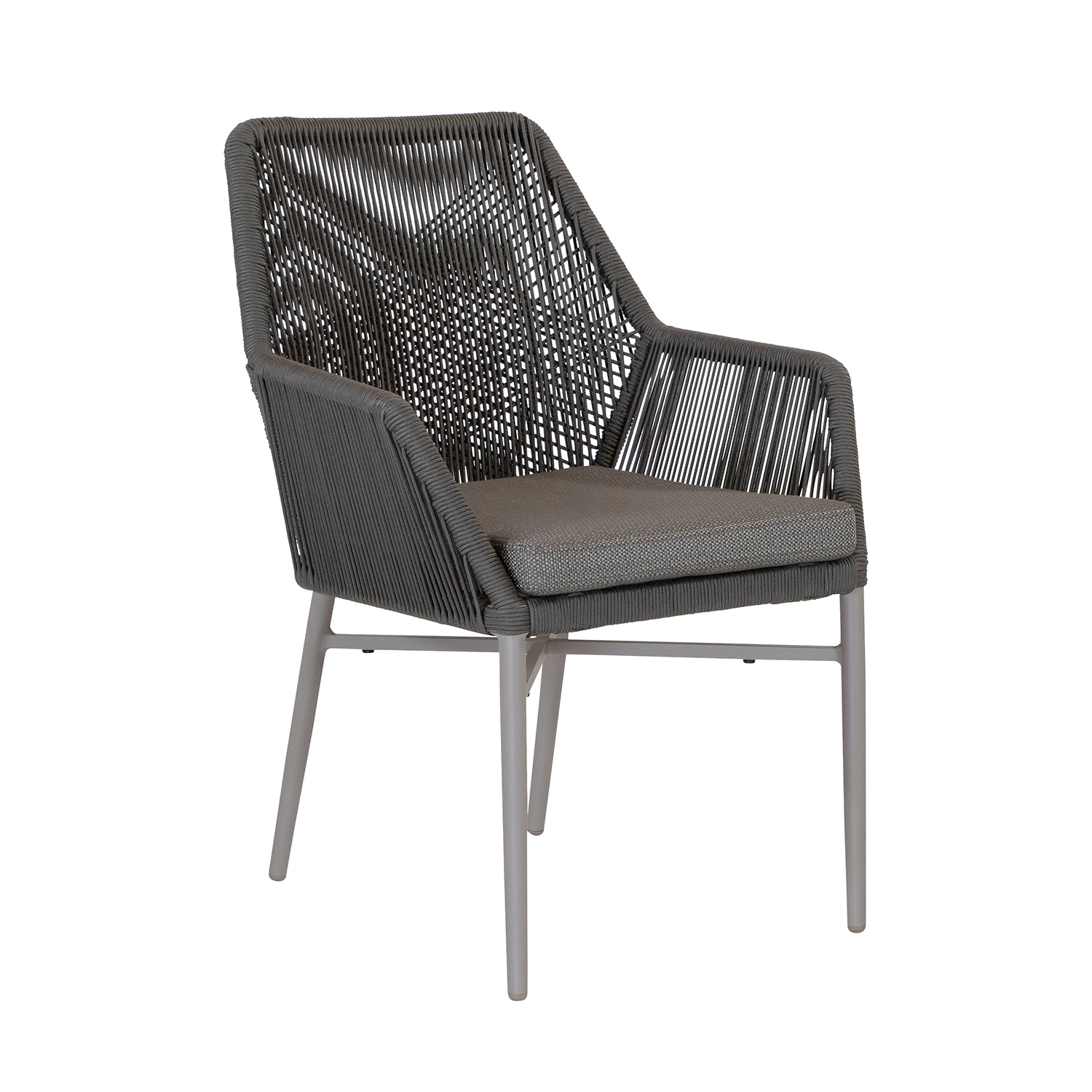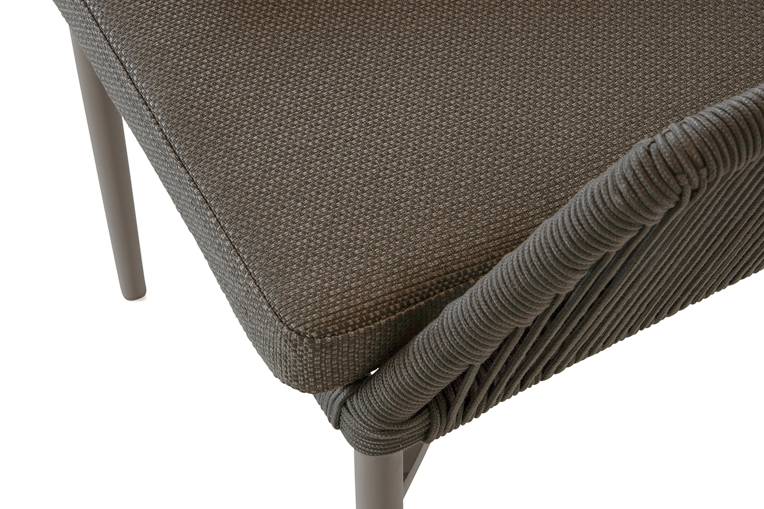 Matstolen Vista har en khakifärgad stomme med flätade textilrep och dyna i färgen oliv. Textilrep är ett modernt och tåligt material för utomhusbruk som överbrygger klyftan mellan inomhus och utomhus. Sittdynan har ett allvädersfodral som tack vare liner på insidan av tyget håller stoppning torr vid regnskurar. Bordet är tillverkat i samma khakifärgade aluminium som stolen med kryssben och en bordstopp i teak. Bordsskivan har rundade hörn.