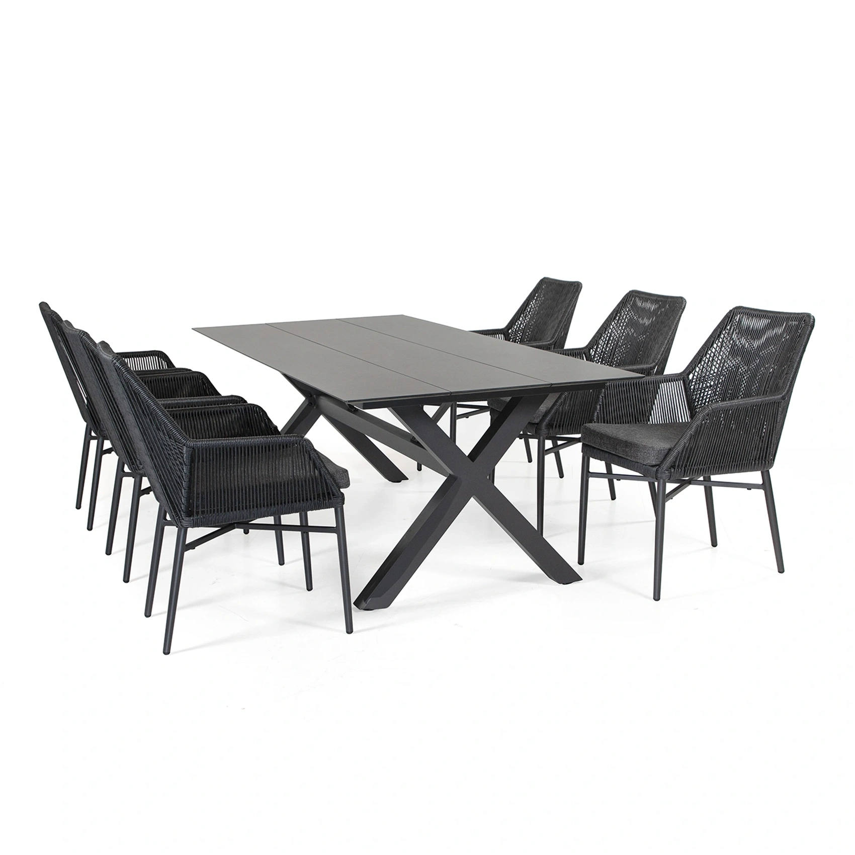 Matgrupp med Vista karmstolar och bordet York. Vista är en elegant karmstol från Atleve med en design som förenar skandinavisk enkelhet med moderna materialval. Stolen har en pulverlackerad aluminiumstomme i mörkgrått med mörkgråa konstrottingband. Dynan ingår. Matbordet är ett York aluminiumbord i storleken 220×100 cm. Bordsskivan är i kompaktlaminat (HPL) med ett mörkgrått betongmönstrat ytskikt som skapar en känsla av sten utan att kompromissa med hållbarheten.
