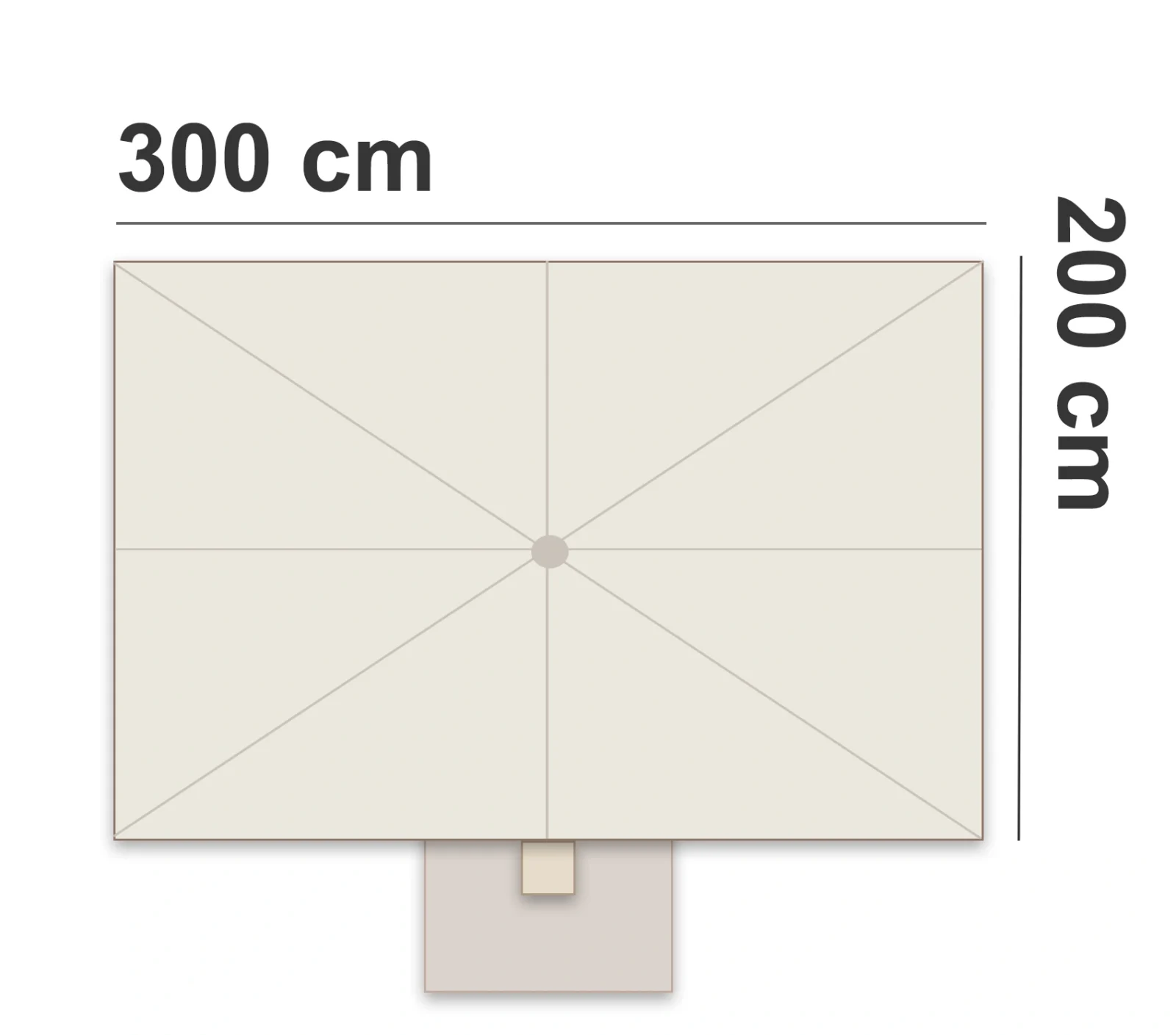 Detta parasoll har en rektangulär parasollduk. Kapellet är 300 cm brett och 200 cm djupt.