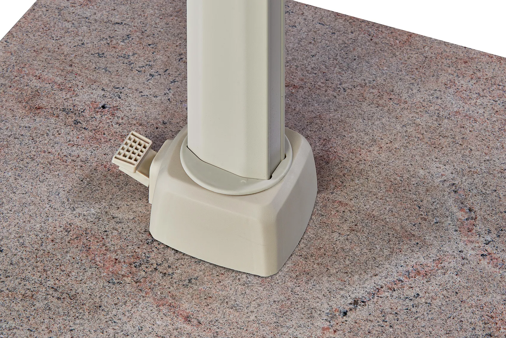Parasollet levereras utan bas eller fotkryss. Parasollet kräver en parasollfotsvikt minst 90 kg. Vi rekommenderar att du placerar detta parasoll på en parasollfot från Platinum Sun & Shade. Dessa är försedda med hjul så att parasollet är lätt att flytta. Platinum Sun & Shade erbjuder även In-Ground parasollfötter som kan grävas ner eller gjutas fast i marken. Detta ger dig mer utrymme på din uteplats.