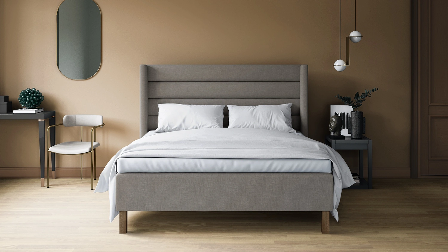 Wonderland Horizon Huvudgavel med vingar ger sovrummet en inbjudande och lyxig känsla.