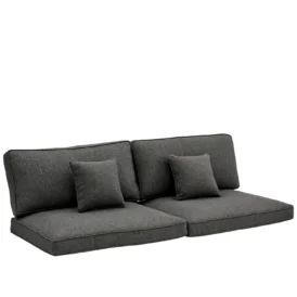 Zalongo, en väldigt elegant soffgrupp i teak med en antracitlackad aluminiumram. Två decokuddar är inkluderade i soffans pris och en i fåtöljens. Dynor i grå textil.